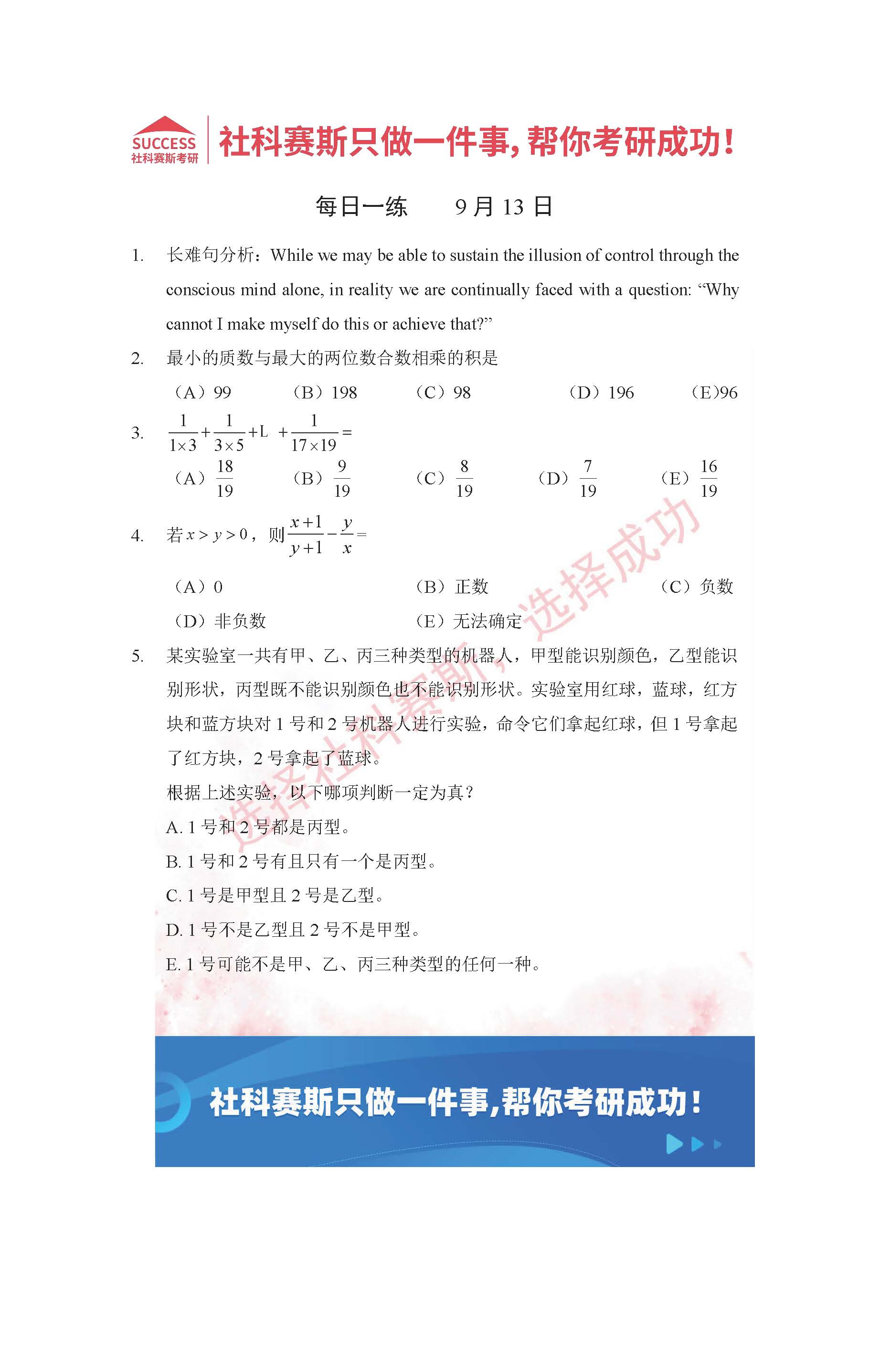 考研是一場持久戰,保持良好的學習習慣,是能確保復習高效的關鍵。今天社科賽斯考研網小編整理了“2022考研每日一練:9月13日管理類聯考每日一練及答案”的內容,希望能對廣大考生有所幫助。
