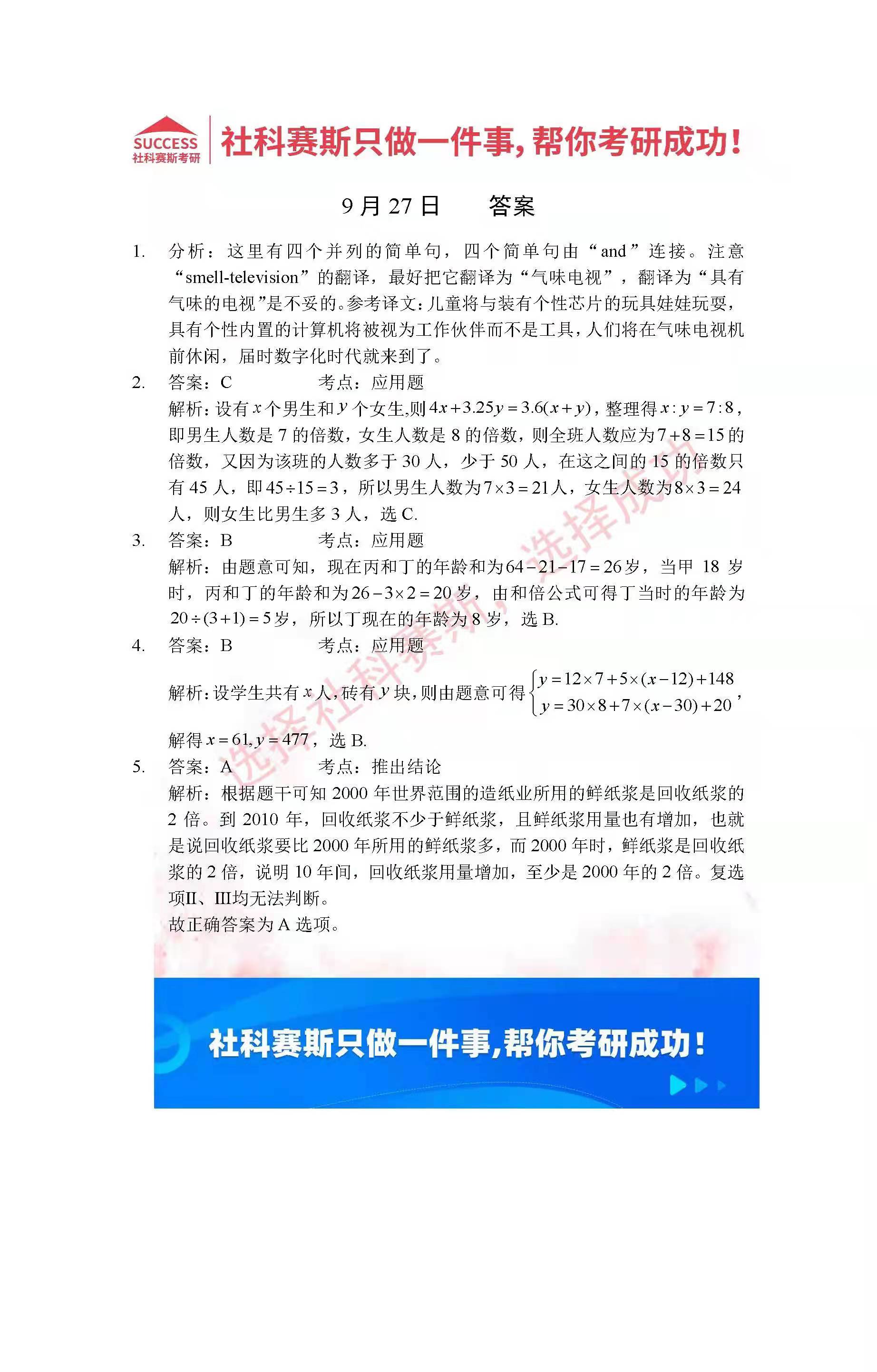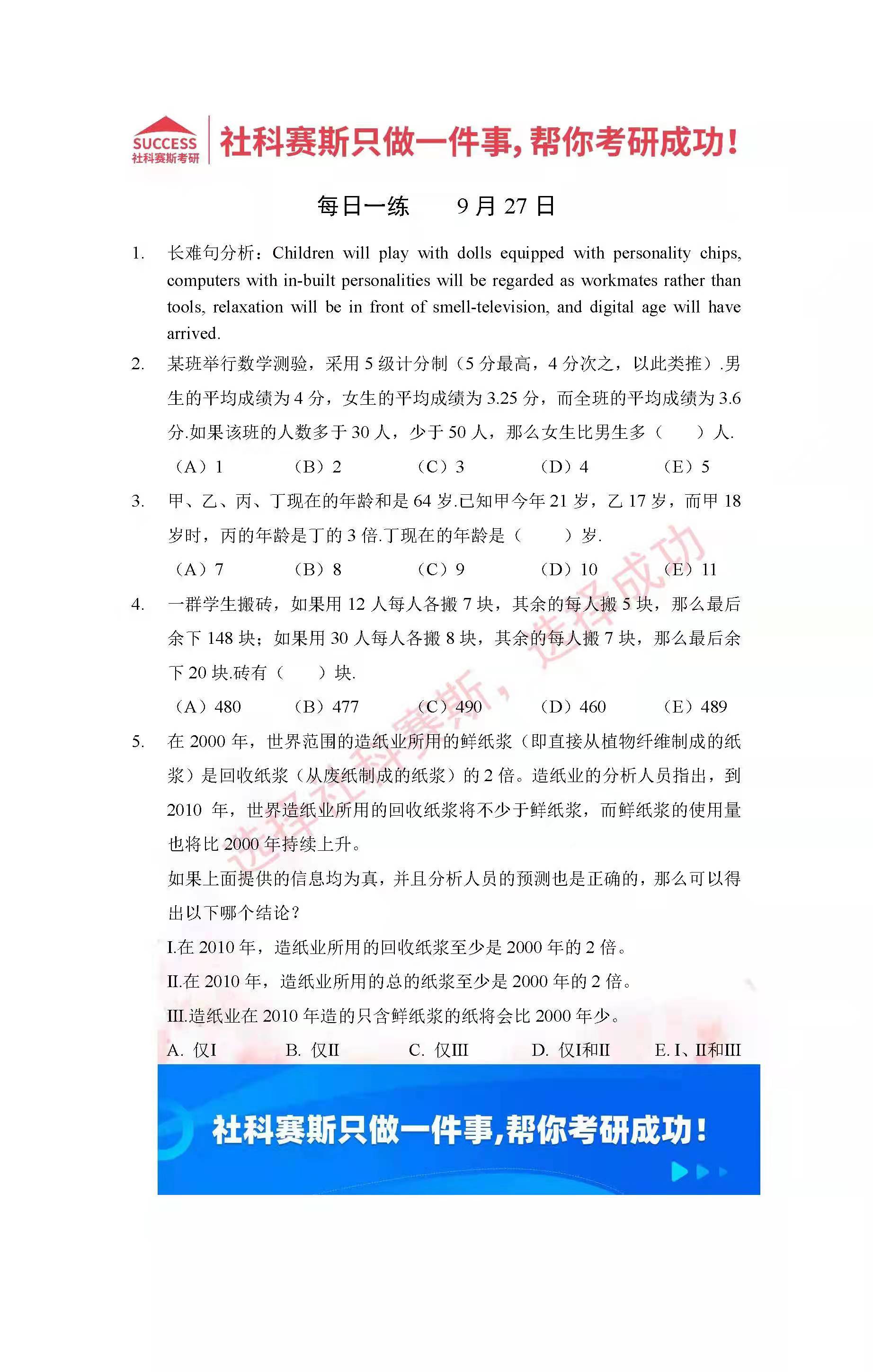 以上就是社科賽斯考研網(wǎng)小編為大家整理2022考研每日一練:9月27日管理類聯(lián)考每日一練及答案的全部內(nèi)容,希望各位考生堅(jiān)持利用起來,更多每日一練內(nèi)容請(qǐng)持續(xù)關(guān)注社科賽斯考研網(wǎng)