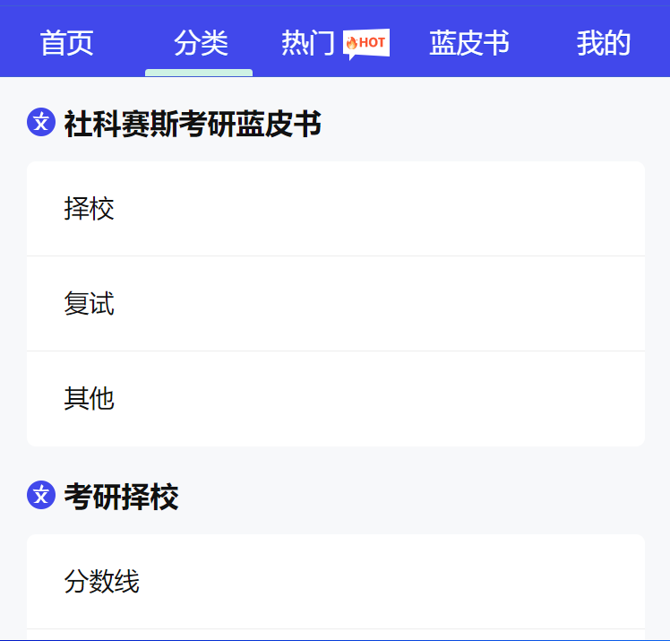 社科賽斯考驗藍皮書、考研擇校、考研備考、考研真題、考研復試、考研調劑、考研通識攻略大全、考證考公這八大類。