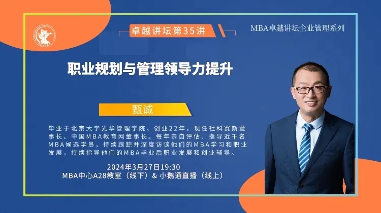 2024年3月27日晚,中財MBA卓越講壇第三十五講特邀社科賽斯董事長、中國MBA教育網董事長甄誠帶來題為《職業規劃與管理領導力提升》的精彩講座分享。本場講座采用線上線下相結合的形式進行,線上參與人數達到2185人次,講座由中央財經大學MBA教育中心教學管理部欒天老師主持。
