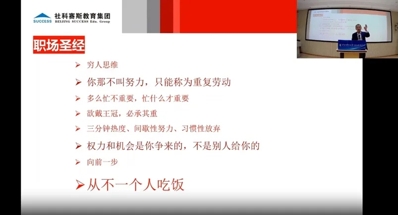 甄誠董事長還分享了百萬年薪的思維模式和自己提煉的“職場圣經”。他表示,努力不是沒有意義的重復勞動,權力和機會是爭來的,而不是別人給的。世界上最可悲的事情不是“我不行”,而是“我本可以”。三分鐘熱度、間歇性努力、習慣性放棄都是導致失敗的根本因素,大家應著重避免并克服。