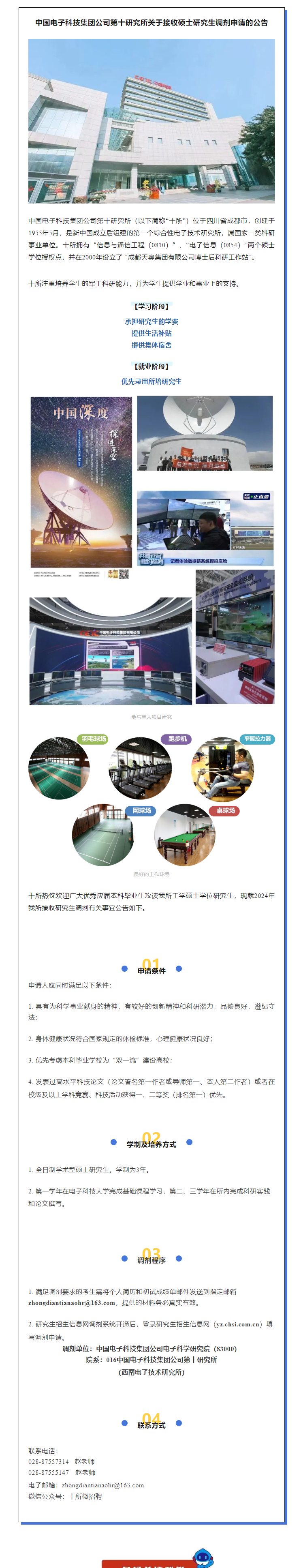 以上就是小編整理“2024考研調劑:中國電子科技集團公司第十研究所2024年關于接收碩士研究生調劑申請的公告”的全部內容,想了解更多調劑信息,請持續關注本網站。