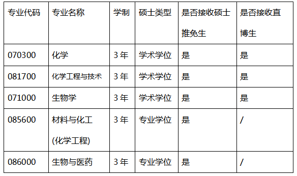 學院現有“化學”、“化學工程與技術”、“生物學”學術型碩士學位授權點,“材料與化工(化工方向)”、“生物與醫藥”工程碩士專業學位授權點,化學一級博士學位授權點和博士后科研流動站。