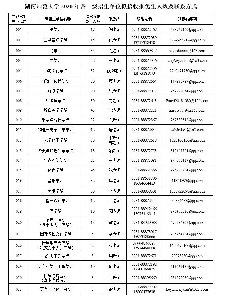 附件1:湖南師范大學2020年各二級招生單位擬招收推免生人數及聯系方式