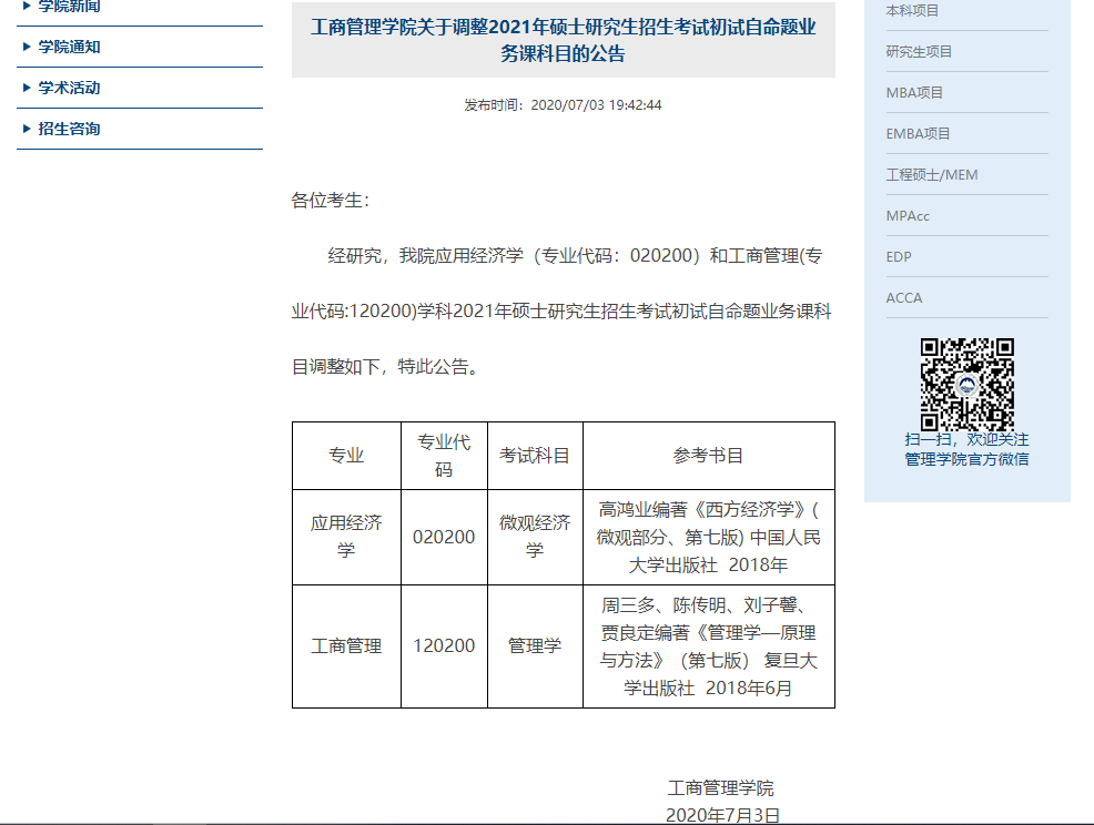 2021考研院校公告:東北大學(xué)工商管理學(xué)院關(guān)于調(diào)整2021年碩士研究生招生考試初試自命題業(yè)務(wù)課科目的公告