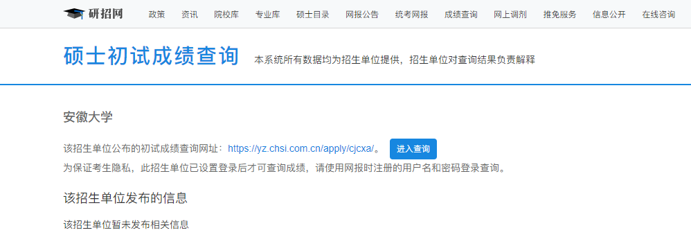 安徽大學考研初試成績查詢入口https://yz.chsi.com.cn/apply/cjcx/sch/10357.dhtml