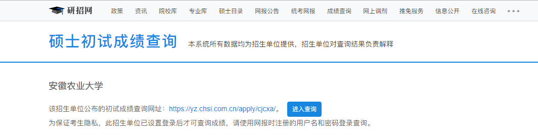安徽農業大學考研初試成績查詢入口:https://yz.chsi.com.cn/apply/cjcx/sch/10364.dhtml
