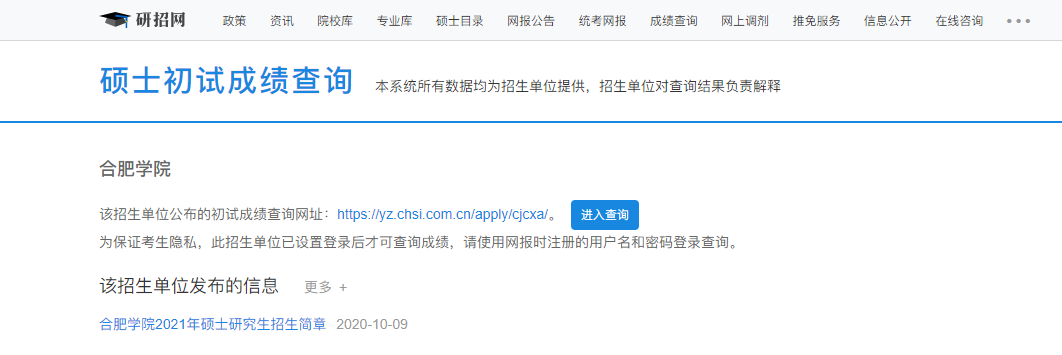 合肥學(xué)院考研初試成績(jī)查詢?nèi)肟?/span>:https://yz.chsi.com.cn/apply/cjcx/sch/11059.dhtml