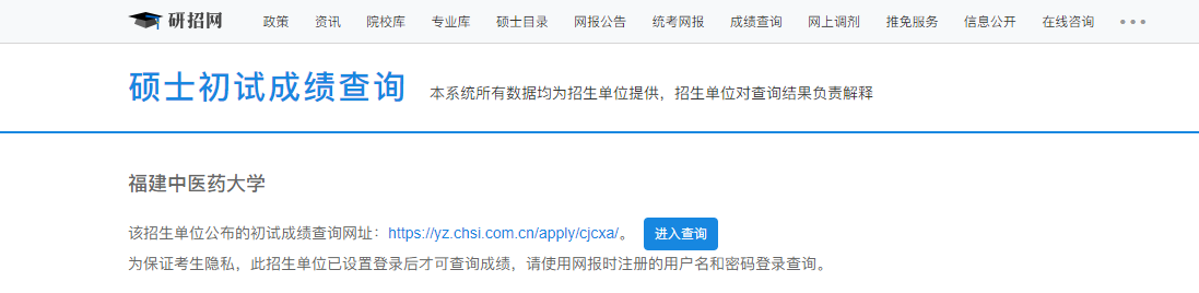 福建中醫(yī)藥大學考研初試成績查詢?nèi)肟?/span>:https://yz.chsi.com.cn/apply/cjcx/sch/10393.dhtml