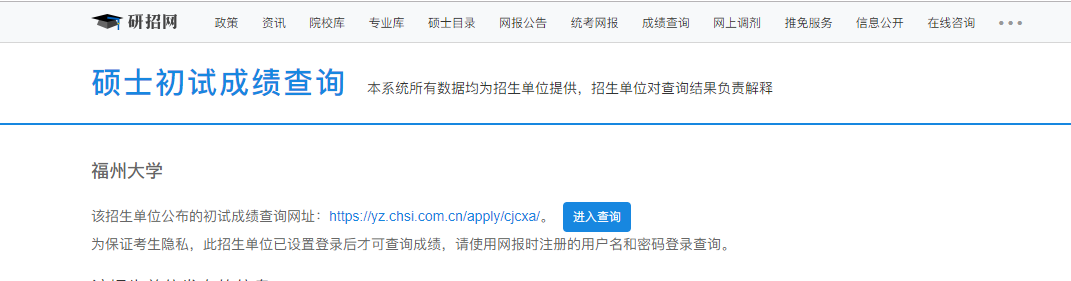 福州大學考研初試成績查詢入口:https://yz.chsi.com.cn/apply/cjcx/sch/10386.dhtml