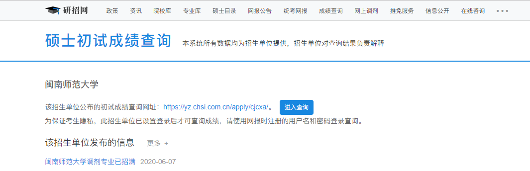 閩南師范大學考研初試成績查詢入口:https://yz.chsi.com.cn/apply/cjcx/sch/10402.dhtml