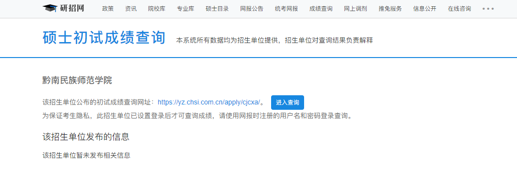 黔南民族師范學院考研初試成績查詢入口https://yz.chsi.com.cn/apply/cjcx/sch/10670.dhtml