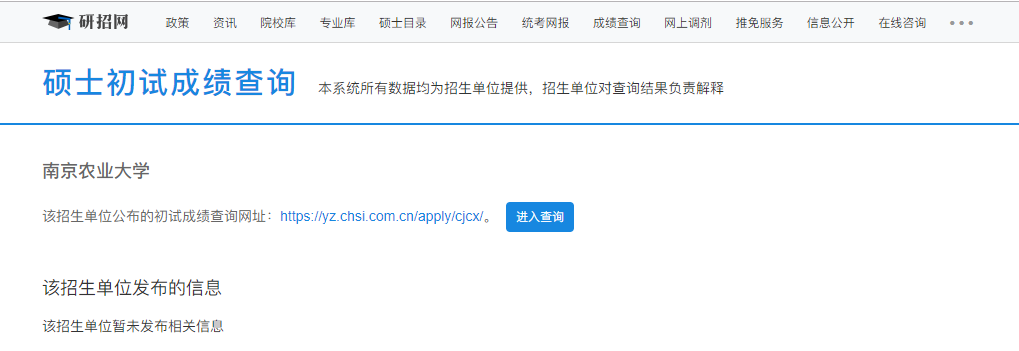 南京農(nóng)業(yè)大學(xué)考研初試成績查詢?nèi)肟?/span>:https://yz.chsi.com.cn/apply/cjcx/sch/10307.dhtml