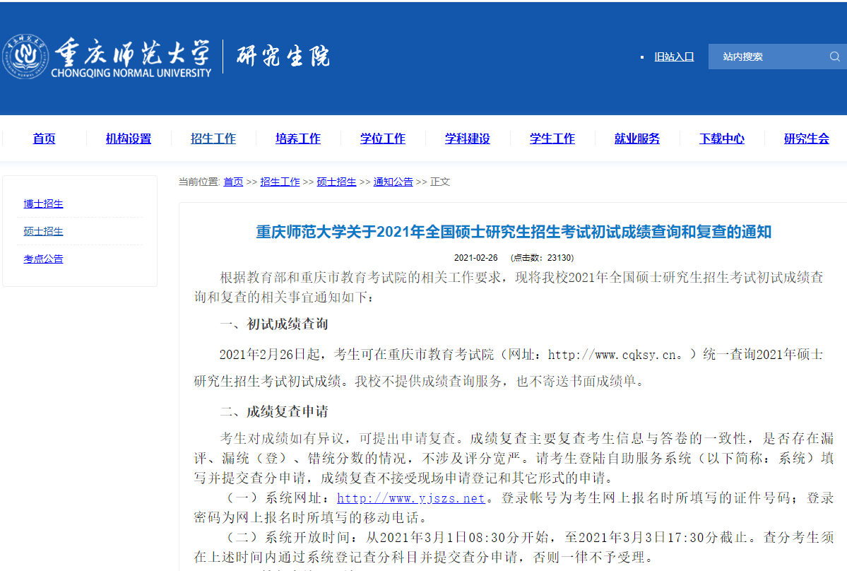 2021考研初試成績:重慶師范大學考研初試成績查詢入口開啟!初試成績已公布!