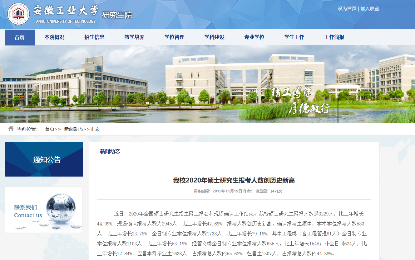 2020考研現場確認已經結束!網上有人預測說2020考研報考人數將超過350萬,目前官方總統計數據還未出來,但已有部分院校和省市公布了2020考研報考人數。今天,小編給大家帶來“安徽工業大學2020碩士研究生報考人數比去年增長了44.09% ”的相關新聞內容,大家可以了解一下哦!