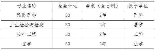 (四)法學專業文理兼招,醫學類畢業生優先,不招收法學類專業畢業生;預防醫學專業招收臨床醫學類畢業生;衛生檢驗與檢疫專業招收藥學類畢業生;安全工程專業招收醫學類畢業生。