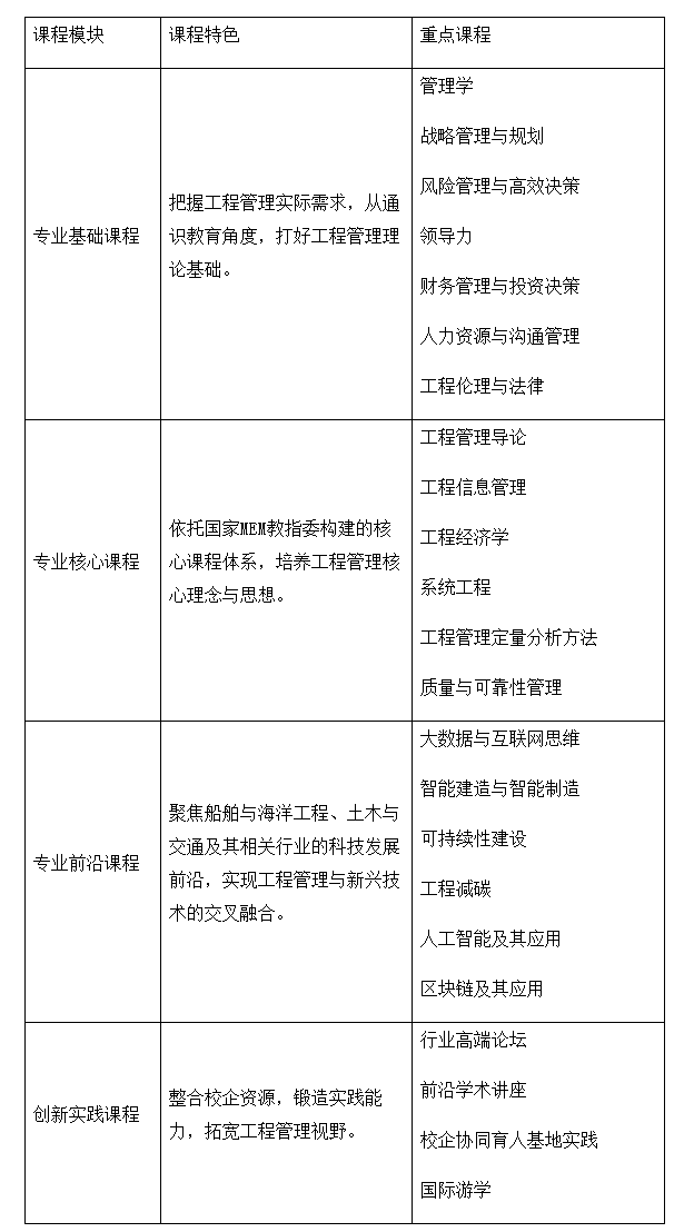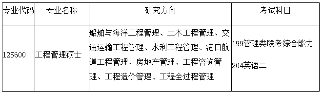 招生領域:包括但不限于船舶與海洋工程、土木工程、交通運輸工程、水利工程、港口航道工程管理、房地產、工程咨詢、工程造價、工程全過程管理等,以及相關行業。