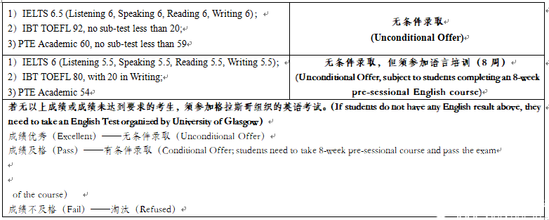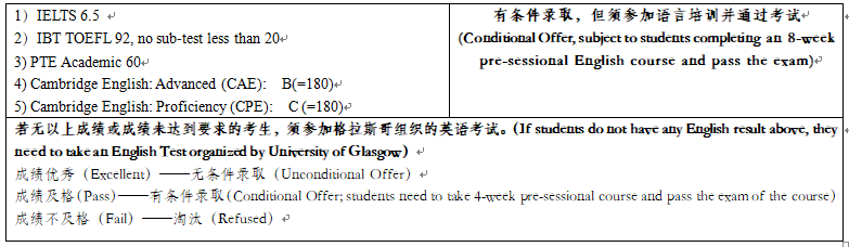 南開大學-格拉斯哥大學聯(lián)合研究生院各專業(yè)復試由相關學院組織,南開大學與格拉斯哥大學教授共同參與。通過該復試的考生,同時須滿足格拉斯哥大學語言條件,將被該專業(yè)錄取。格拉斯哥大學語言要求如下:
