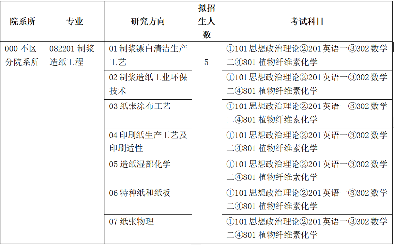 (三)全國統考初試科目為思想政治理論、英語(一)、數學(二)、植物纖維素化學,其中思想政治理論、英語(一)、數學(二)由教育部統一命題,植物纖維素化學由我院組織命題。