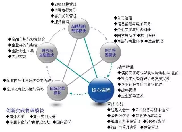 暨南大學EMBA結合新時代前瞻訴求,創新EMBA課程體系,以核心課程教學為主,輔以五大選修模塊向學員傳授全面系統的、反映當代管理思想與實踐最新發展成果的專業理論與方法技術,幫助管理者有效地與企業實際、與中國實際相結合,從而推動企業的快速發展。