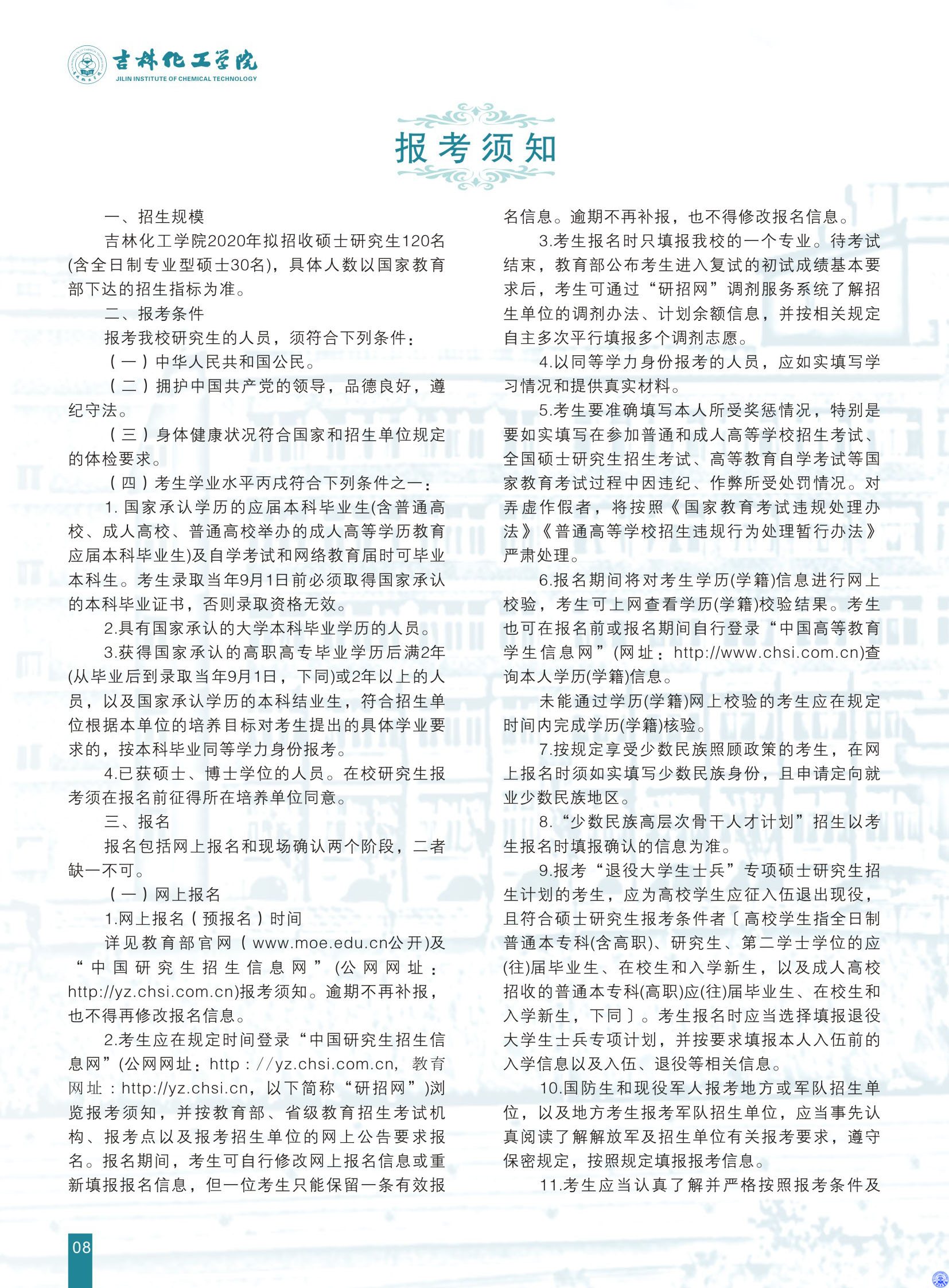 2020年碩士研究生招生簡章陸續已出,今天小編給大家整理的是“吉林化工學院2020年全日制碩士研究生招生簡章的相關內容,有報考意愿的小伙伴要注意下哦!