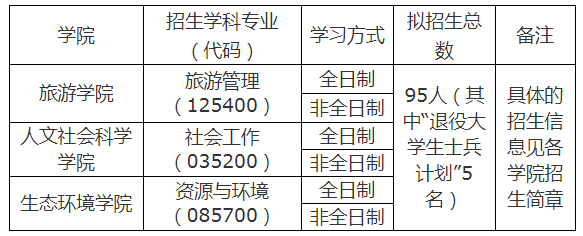 我校旅游管理、社會工作、資源與環境3個碩士專業學位的報考條件、招生對象、初試科目、學費標準、學習方式及學制等相關信息見各學院的招生簡章。