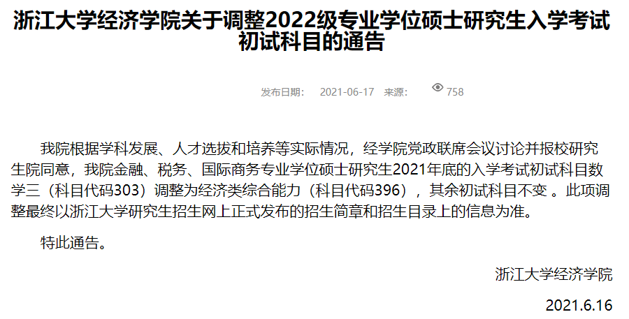 原文標題:浙江大學經濟學院關于調整2022級專業學位碩士研究生入學考試初試科目的通告